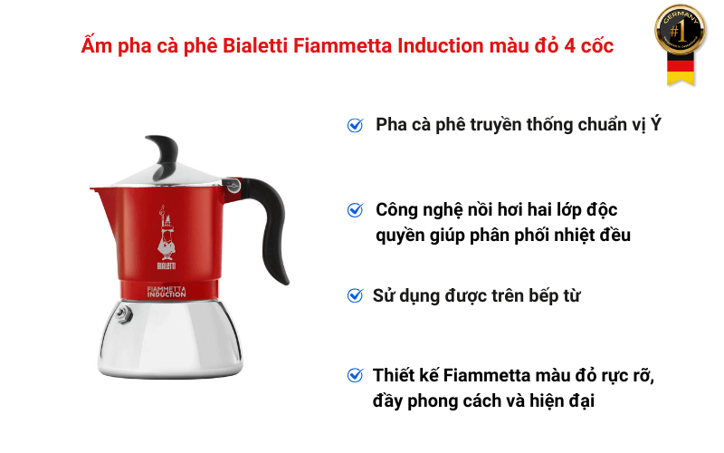 Ấm pha cà phê Bialetti Fiammetta Induction 4 cốc màu đỏ là sự kết hợp hoàn hảo giữa truyền thống pha chế Moka pot trứ danh của Ý và công nghệ hiện đại. Đây là giải pháp lý tưởng cho những ai yêu thích hương vị cà phê đậm đà ngay tại nhà, đồng thời tìm kiếm một điểm nhấn thiết kế đầy phong cách và rực rỡ. Cùng Germany S&T khám phá tính năng nổi bật của sản phẩm ngay tại đây!