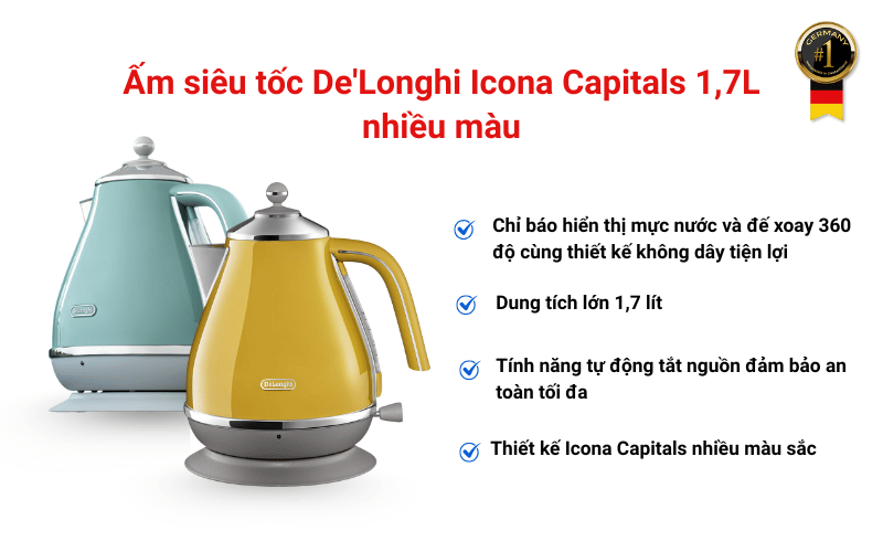 Đặc điểm nổi bật của Ấm siêu tốc De'Longhi Icona Capitals 1,7L nhiều màu