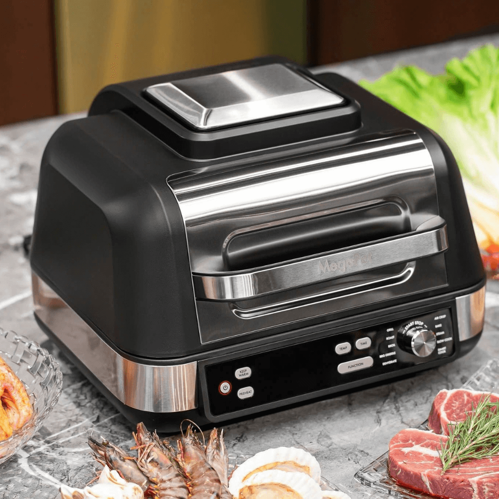 Bếp đa năng Megapot Germany sở hữu khả năng nấu nướng vượt trội với 10 chức năng chính như: nướng, quay, nướng rau củ, nướng BBQ trên vỉ, sấy, nấu thông minh, nướng bánh, hấp, nấu chậm, chiên không dầu và giữ ấm.