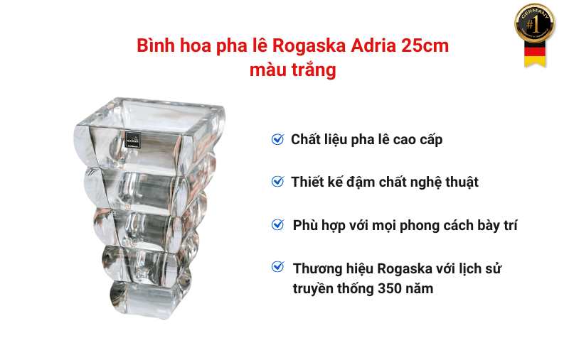 Rogaska là thương hiệu pha lê cao cấp hàng đầu thế giới, mang trong mình 350 năm lịch sử hình thành và phát triển. Với kinh nghiệm lâu dài và đẳng cấp vượt trội, Rogaska đã chiếm lĩnh thị trường và xây dựng được một vị thế vững mạnh, nổi bật với các bộ sưu tập bình hoa pha lê mang thiết kế hiện đại, phá cách, thể hiện rõ nét sự xa hoa và sang trọng.
