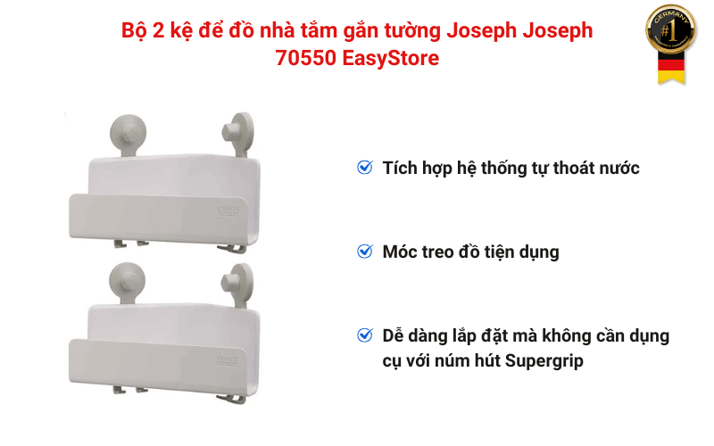 Với bộ 2 kệ để đồ Joseph Joseph 70550 EasyStore, bạn không chỉ sở hữu một sản phẩm dụng cụ nhà tắm tiện lợi, bền bỉ, mà còn đem lại sự gọn gàng, tinh tế cho không gian sống. Từng chi tiết từ hệ thống thoát nước thông minh, núm hút chắc chắn, đến khả năng chịu lực tuyệt vời đều được thiết kế để nâng cao chất lượng cuộc sống, giúp việc tổ chức nhà cửa trở nên dễ dàng hơn. Đặt mua ngay tại Germany S&T để trải nghiệm chất lượng sản phẩm chuẩn Đức với mức giá tốt nhất!