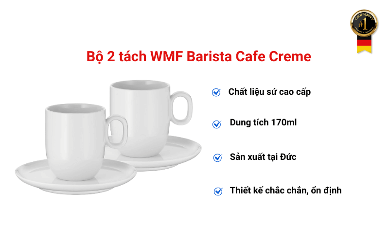 Đặc điểm nổi bật của Bộ 2 tách WMF Barista Cafe Creme Bộ 2 Tách WMF Barista Cafe Creme 170ml - Nghệ Thuật Cà Phê ĐứcWMF - 170 Năm Tiên Phong Dụng Cụ Nhà Bếp ĐứcWMF (Württembergische Metallwarenfabrik) được thành lập năm 1853 tại Geislingen, Đức, là một trong những thương hiệu dụng cụ nhà bếp đặc biệt là dụng cụ pha chế lâu đời và uy tín nhất châu Âu. Với hơn 170 năm kinh nghiệm, WMF đã trở thành biểu tượng của chất lượng Đức - nơi mỗi sản phẩm đều được chế tác với độ chính xác cao nhất và đạt tiêu chuẩn khắt khe. Bộ 2 tách WMF Barista Cafe Creme chính là sự kết tinh hoàn hảo của di sản 170 năm ấy - một sản phẩm được thiết kế dành riêng cho những ai yêu thích nghệ thuật cà phê.