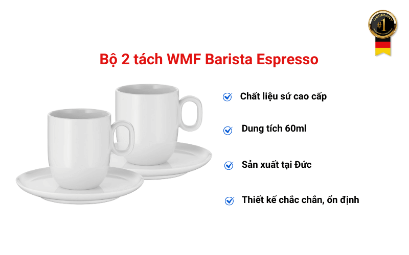 Thiết kế chắc chắn, ổn định Câu hỏi thường gặp (FAQ)1. Dung tích 60ml phù hợp cho loại cà phê nào? dung tích chuẩn vàng dành cho Espresso nguyên chất – bao gồm cả Single Espresso và Double Espresso (Doppio) 2. Tách có giữ nhiệt tốt không? Có, nhờ độ dày sứ tối ưu, tách giữ nhiệt tốt hơn 30-40% so với sứ mỏng thông thường. 3. Tách có nặng không? Không, vừa đủ trọng lượng để cảm thấy chắc chắn, cao cấp nhưng không quá nặng khi cầm. 4. Có thể dùng cho trà không? Hoàn toàn có thể, nhưng hình dạng được thiết kế tối ưu cho cà phê sữa. 5. Đĩa lót có dễ bị vỡ không? Không, sứ WMF nung nhiệt độ cao rất bền, chịu va đập tốt. 6. Có thể kết hợp với dòng sản phẩm nào? Đồng bộ hoàn hảo với toàn bộ dòng WMF Barista (Espresso, Cappuccino, Latte Macchiato, hũ đường sữa). 7. Ai nên mua sản phẩm này?