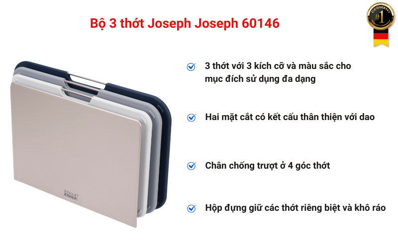 Tổng thể, Bộ 3 thớt Joseph Joseph 60146 không chỉ là một bộ thớt thông thường mà còn là sự kết hợp hoàn hảo giữa tính thông minh, tiện ích và tính thẩm mỹ. Với thiết kế tinh tế, tính năng đa dạng và chất lượng đảm bảo, sản phẩm này đích thực là một trợ thủ đắc lực trong việc chuẩn bị các món ăn ngon cho gia đình. Sở hữu ngay tại Germany S&T để trải nghiệm sự tiện lợi từ sản phẩm nội địa Đức cao cấp!