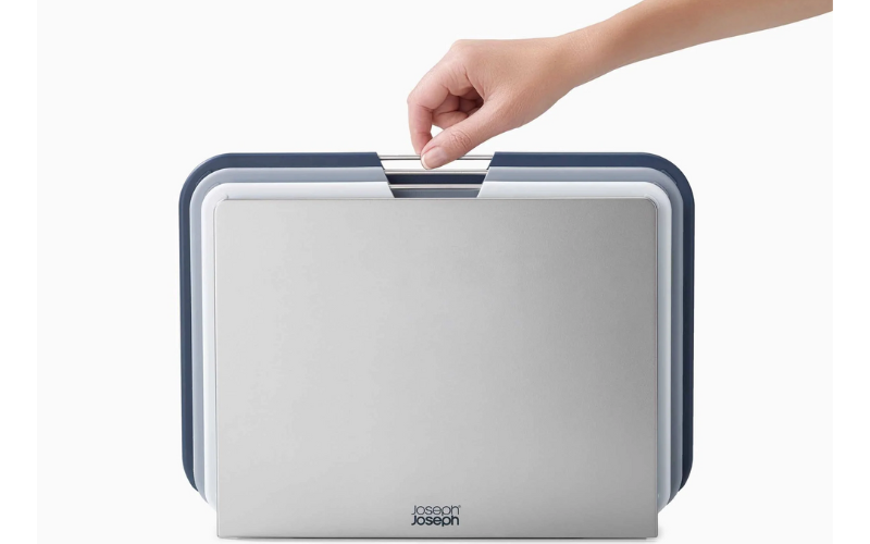 Những chiếc thớt thông thường chỉ có 1 lỗ treo nhỏ hoặc các móc treo lỏng lẻo. Nhưng Joseph Joseph luôn mang đến cho người dùng những thiết kế tiện dụng nhất. Mỗi chiếc thớt đều có phần tay cầm bằng thép không gỉ ở cạnh, giúp bạn dễ dàng nhấc thớt ra khỏi giá đỡ một cách nhẹ nhàng, không lo tuột tay.