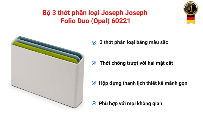 Bộ 3 thớt phân loại Joseph Joseph Folio Duo (Opal) 60221 là một sản phẩm không thể thiếu trong căn bếp của mỗi gia đình. Với thiết kế thông minh, tính năng tiện dụng và vẻ ngoài thanh lịch, bộ thớt này sẽ giúp bạn sơ chế thực phẩm một cách an toàn, hiệu quả và góp phần tạo nên một không gian bếp ngăn nắp và đẹp mắt.