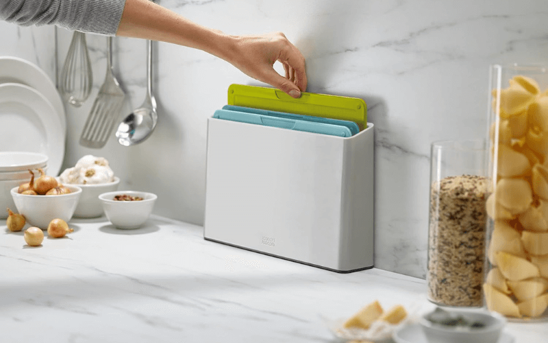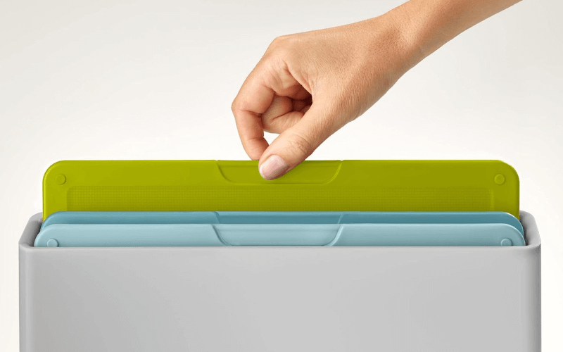 Các thớt có thể dễ dàng nhấc ra khỏi hộp đựng nhờ chi tiết bám ngón tay được thiết kế thông minh trên mỗi thớt.