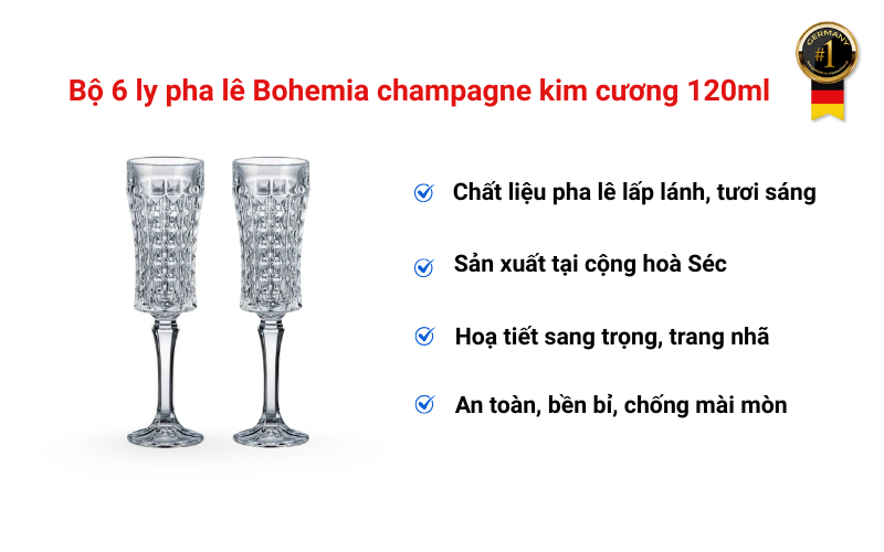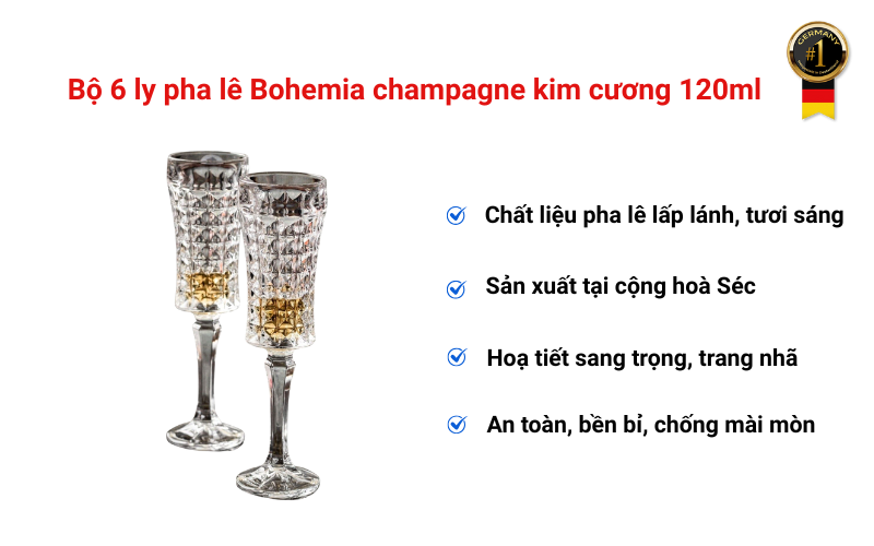Bộ 6 ly pha lê Bohemia Champagne Kim Cương 120ml được chế tác từ pha lê không chì cao cấp, an toàn cho sức khỏe và thân thiện với môi trường. Chất liệu pha lê tinh khiết mang đến độ trong suốt, sáng bóng cùng khả năng phản chiếu ánh sáng tuyệt mỹ – tạo nên vẻ đẹp sang trọng, tinh tế đặc trưng của thương hiệu Bohemia, biểu tượng pha lê thủ công trứ danh từ Cộng hòa Séc.