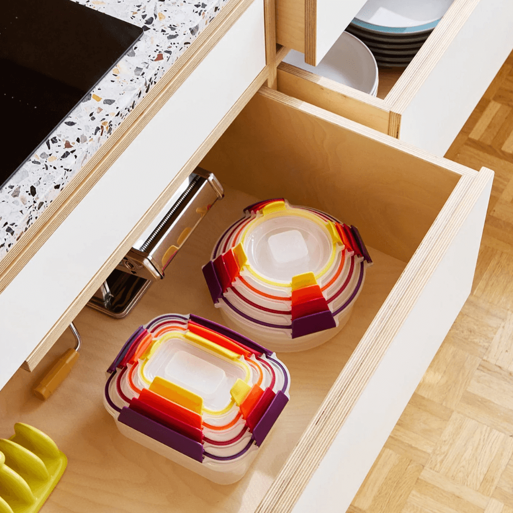 Một trong những ưu điểm nổi bật của bộ hộp Joseph Joseph 1000013 là thiết kế nắp và đáy hộp có cùng mã màu, giúp người dùng nhanh chóng nhận biết và ghép đúng nắp hộp chỉ trong vài giây. Các nắp hộp được phối những gam màu nổi bật như tím, đỏ, cam vàng, vừa tạo điểm nhấn sinh động cho gian bếp, vừa nâng cao tính tiện dụng trong quá trình sử dụng hằng ngày. Nhờ thiết kế này, bạn sẽ không còn mất thời gian tìm kiếm nắp hộp phù hợp hay lo lắng về việc nhầm lẫn giữa các kích thước khác nhau.