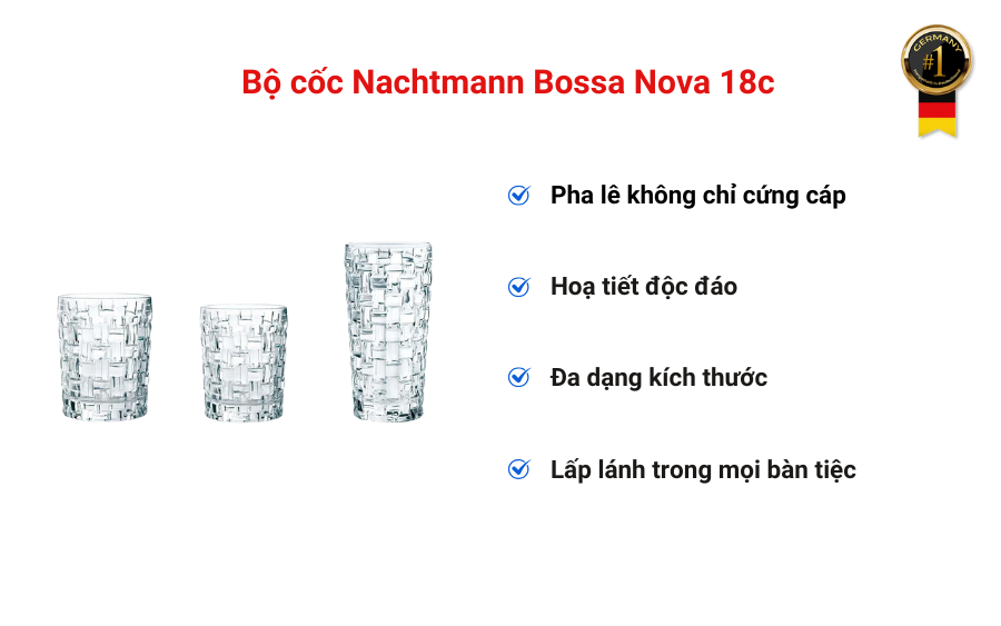Bộ cốc Nachtmann Bossa Nova 18c không chỉ là phụ kiện bàn ăn, mà còn là cách bạn thể hiện gu thẩm mỹ và phong cách sống tinh tế. Với chất liệu pha lê bền đẹp, hiệu ứng ánh sáng cuốn hút và khả năng ứng dụng linh hoạt trong mọi bữa tiệc, đây là bộ cốc mà bất kỳ gia đình hay không gian sang trọng nào cũng nên sở hữu. Nếu bạn muốn mang đến trải nghiệm thưởng thức đồ uống đẳng cấp hơn – hãy để Bossa Nova làm điều đó giúp bạn.