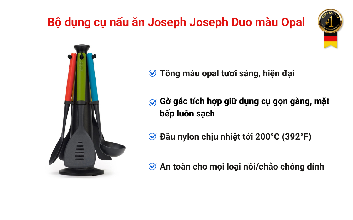 Joseph Joseph Duo màu Opal là bộ dụng cụ nhất định phải có cho bếp hiện đại của gia đình. Với màu sắc tươi sáng, chắc chắn, đầm tay mà lại giữ mặt bếp sạch nhờ gờ gác tích hợp. Không chỉ vậy còn vô cùng an toàn với đầu nylon không BPA chịu nhiệt 200°C, êm bề mặt không làm xước chống dính. Hãy cùng Germany S&T khám phá sản phẩm này nhé!