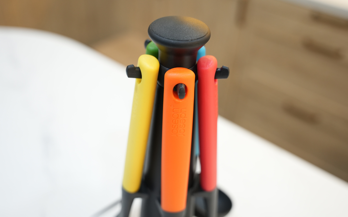 Bộ dụng cụ nấu ăn Joseph Joseph không chỉ dừng lại ở công năng, mà còn là một món đồ trang trí hiện đại cho căn bếp. Tất cả dụng cụ được sắp xếp gọn gàng trên giá đỡ thông minh, tích hợp chân quay 360 độ, cho phép bạn dễ dàng xoay và lựa chọn đúng món cần dùng một cách nhanh chóng, mượt mà mà không phải di chuyển cả bộ.