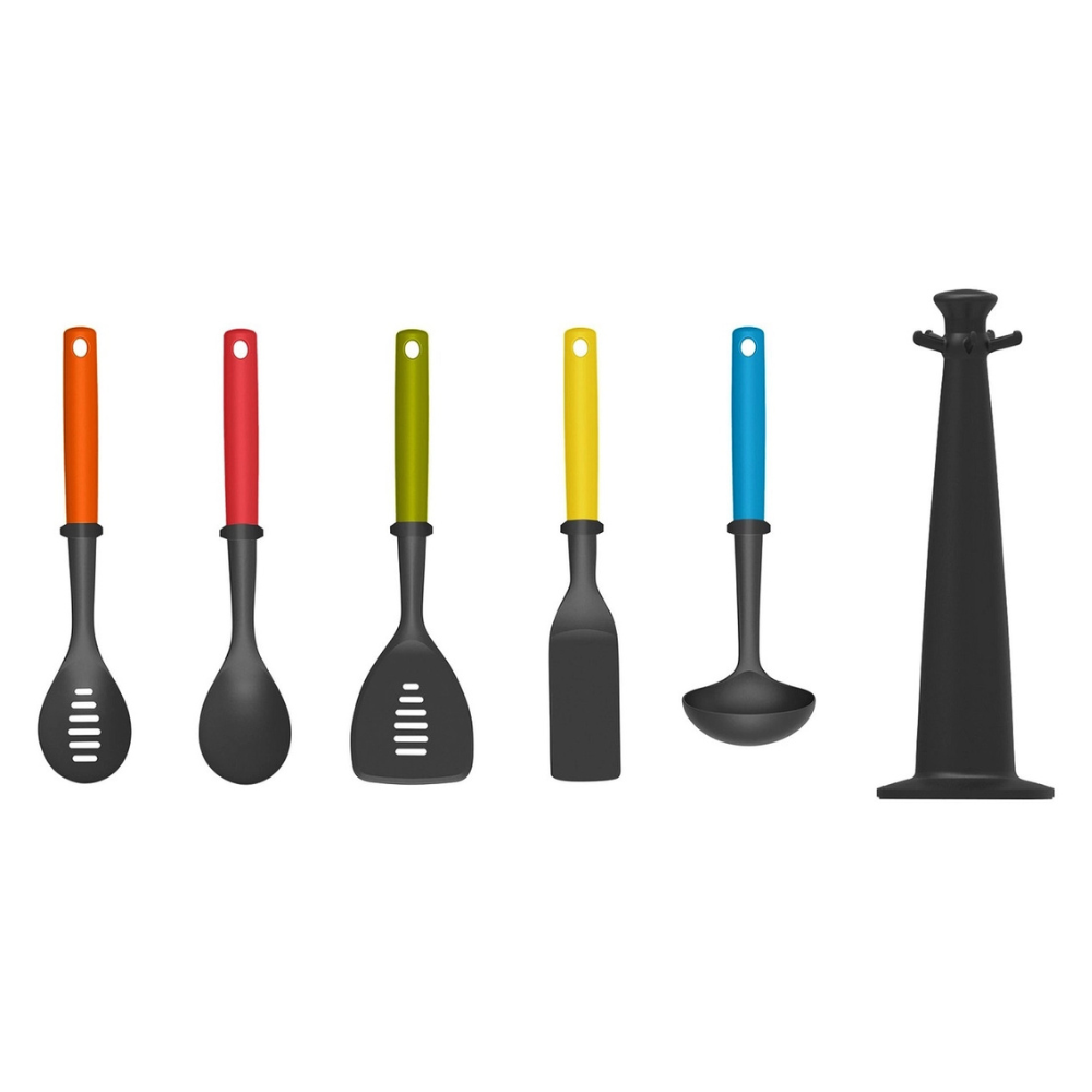 - Bộ 5 món nhiều màu sắc gồm xẻng có lỗ, muôi thủng, muôi canh, xẻng đa năng, muôi kèm giá treo.