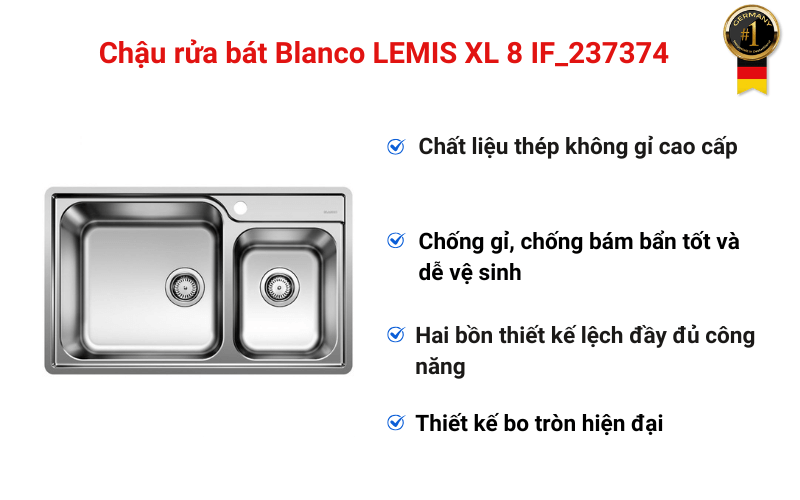 Chậu rửa bát Blanco LEMIS XL 8-IF là minh chứng rõ nét cho triết lý này. Không chạy theo những thiết kế cầu kỳ, sản phẩm tập trung vào sự bền bỉ, khả năng chịu lực, chịu nhiệt và tính an toàn tuyệt đối cho sức khỏe người dùng. Germany S&T tự hào mang tới những sản phẩm chất lượng và chính hãng của Blanco, phục vụ nhu cầu nhà cửa và đời sống của quý khách hàng.