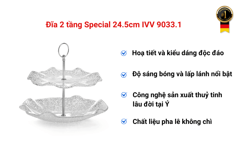 Tóm lại, Đĩa 2 tầng Special 24.5cm IVV 9033.1 là sự lựa chọn hoàn hảo cho những ai yêu thích sự tinh tế, đẳng cấp và quan tâm đến chất lượng cũng như an toàn sức khỏe. Với thiết kế độc đáo, độ sáng bóng lấp lánh, công nghệ sản xuất lâu đời từ Ý và chất liệu pha lê không chì an toàn, sản phẩm này không chỉ là món đồ dùng mà còn là điểm nhấn nghệ thuật cho không gian sống của bạn. Liên hệ ngay Germany S&T để sở hữu ngay sản phẩm này!