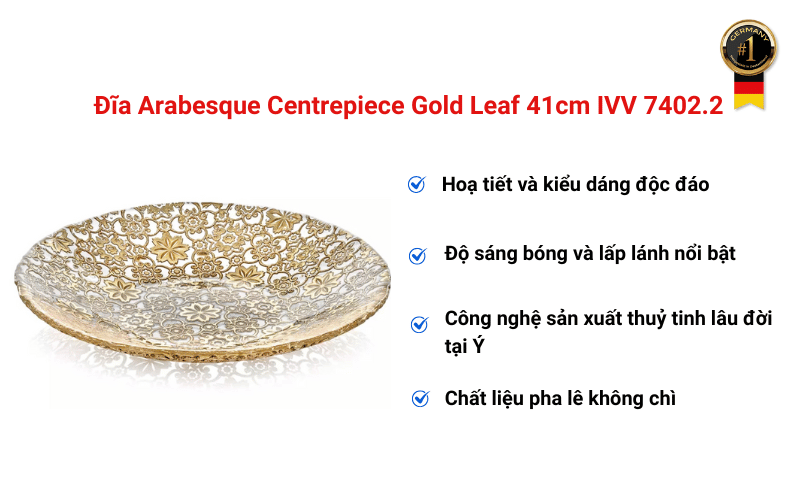 Tóm lại, Đĩa Arabesque Centrepiece Gold Leaf 41cm IVV 7402.2 hội tụ đầy đủ 4 yếu tố vàng: Hoạ tiết lá vàng độc đáo nổi bật tinh xảo, độ sáng bóng lấp lánh vượt trội, công nghệ Tuscany 70+ năm kết hợp truyền thống và đổi mới, pha lê không chì an toàn trong suốt, và đặc biệt là thương hiệu IVV Ý uy tín có mặt 70+ quốc gia. Đầu tư một lần cho tác phẩm nghệ thuật thủy tinh - đó chính là giá trị thực sự của Made in Italy! Liên hệ ngay Germany S&T để sở hữu sản phẩm này!