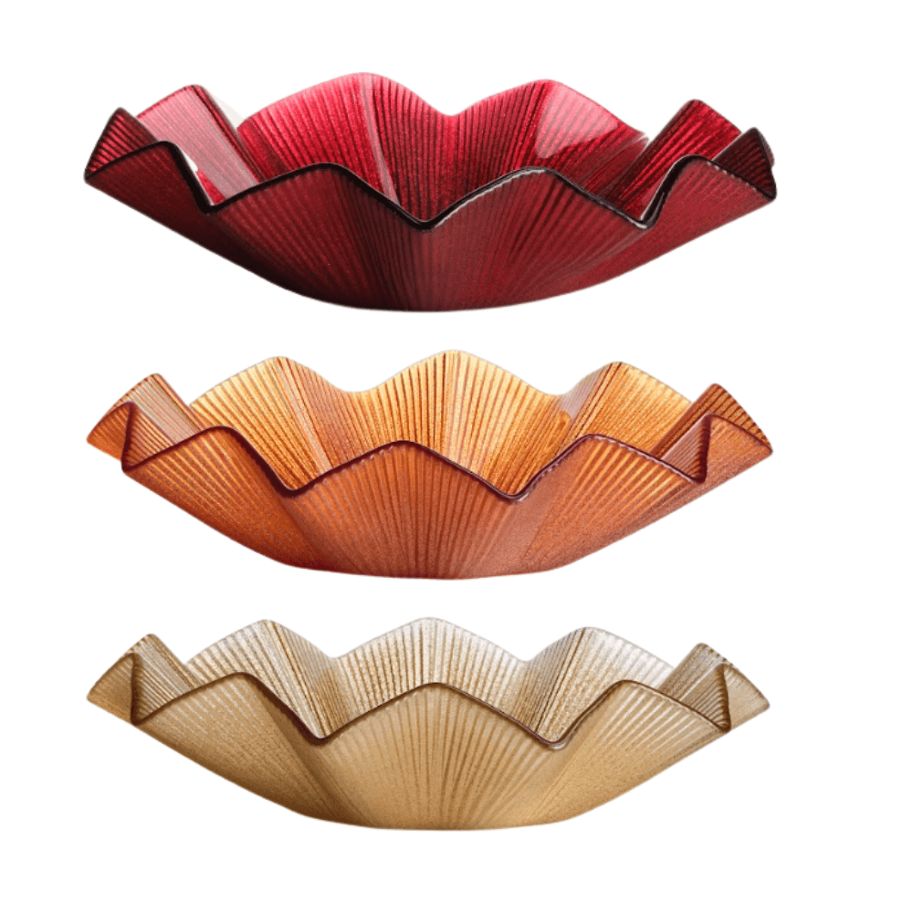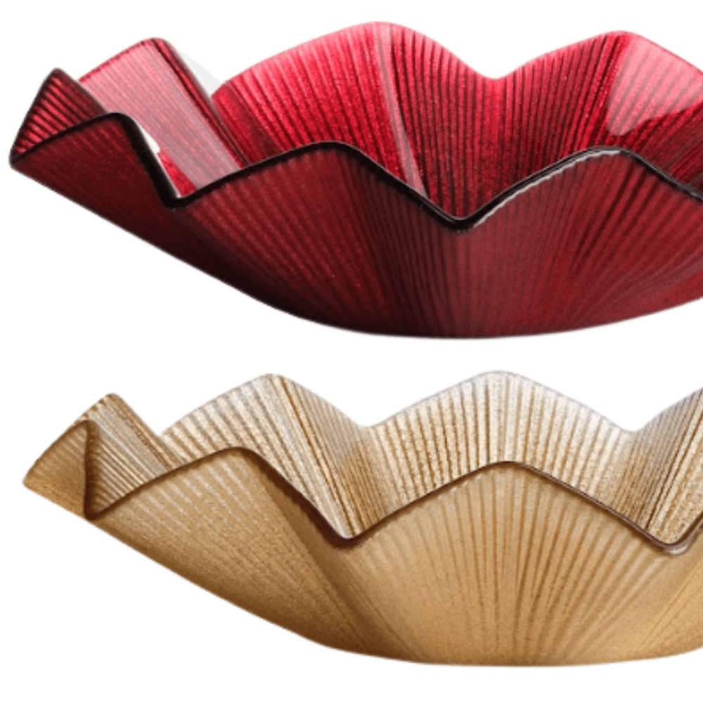Đặc biệt, kết hợp với thiết kế viền scallop (viền sóng) được uốn nắn tinh tế, tạo nên những đường cong mềm mại và thanh lịch, mang đậm phong cách cổ điển nhưng vẫn giữ nét hiện đại, sang trọng. Khi ánh sáng chiếu lên, các đường viền phản chiếu lấp lánh, khiến chiếc đĩa trở nên rực rỡ và cuốn hút hơn – một điểm nhấn tinh xảo khó có thể bỏ qua trong không gian trang trí.