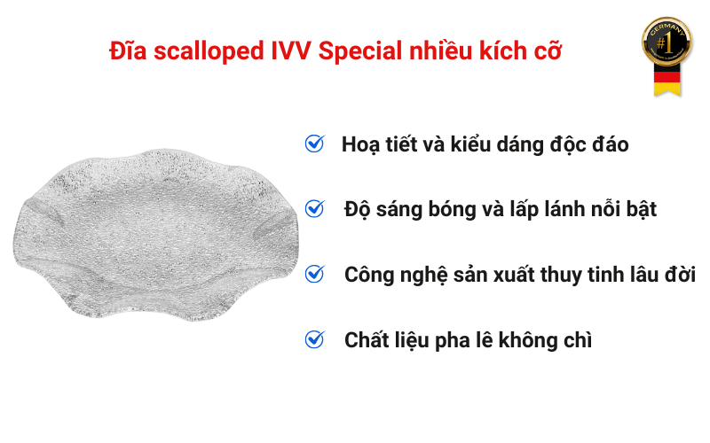Từ chất liệu pha lê không chì cao cấp đến thiết kế gợn sóng mềm mại, đĩa Scalloped IVV Special không chỉ là vật dụng phục vụ bữa ăn mà còn là biểu tượng của sự tinh tế và đẳng cấp. Mỗi chiếc đĩa là minh chứng cho nghệ thuật chế tác thủ công Ý – sang trọng, bền bỉ và đầy cảm xúc.