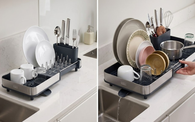 Được thiết kế đặc biệt để phù hợp với những gian bếp có diện tích khiêm tốn, giá úp bát ban đầu có kích thước rất nhỏ gọn. Tuy nhiên, khi có nhu cầu sử dụng lớn hơn, bạn hoàn toàn có thể kéo dài khay chứa ra một cách dễ dàng. Bạn có thể thoải mái sắp xếp thêm nhiều bát đĩa, xoong nồi sau những bữa tiệc gia đình mà không lo chật chội.