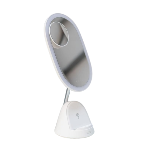 Chân đế gương tích hợp sạc không dây Qi 9V/1A, cho phép vừa đặt điện thoại vừa sử dụng gương. Bạn có thể xem video hướng dẫn, gọi video hoặc giải trí khi trang điểm mà không cần cầm thiết bị trên tay, tối ưu không gian bàn trang điểm nhỏ hoặc góc làm việc hạn chế.