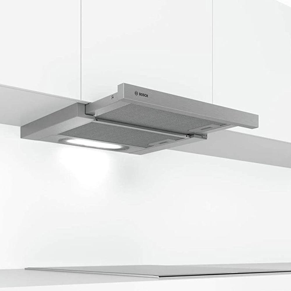 Giống với máy hút mùi Electrolux, Bosch DFR067A50 sử dụng tông màu xám, làm bằng chất liệu thép không gỉ để tạo vẻ chuyên nghiệp cho căn bếp, bên cạnh đó còn chống bám dính dấu vân tay, dễ dàng lau chùi ở bên ngoài thân máy