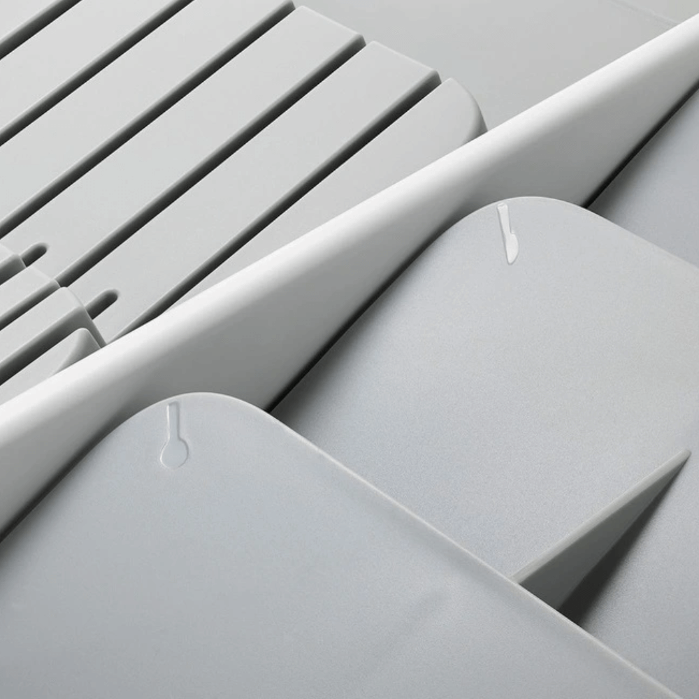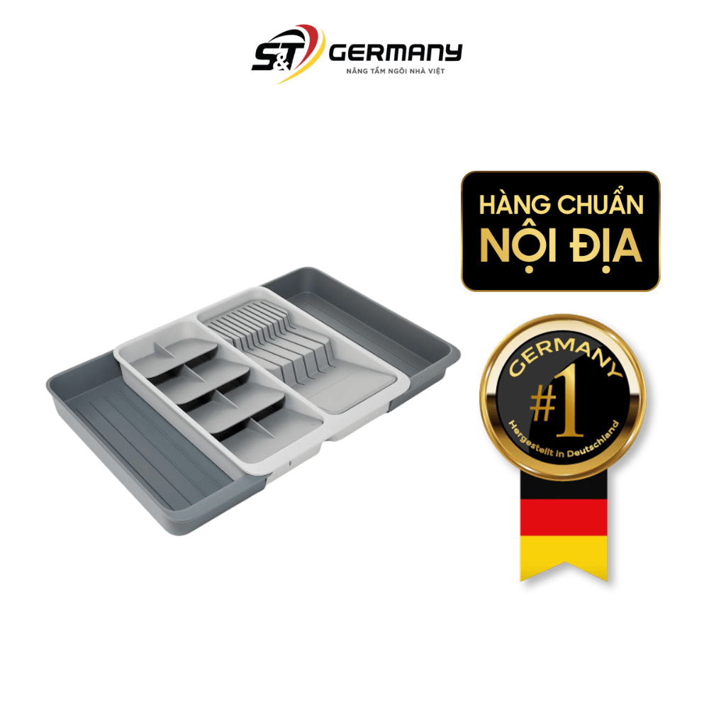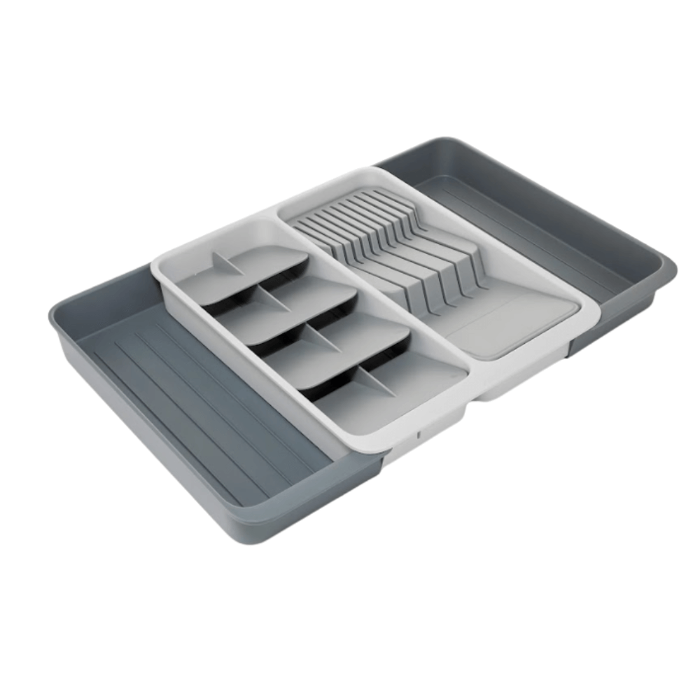 Bộ sản phẩm bao gồm một hộp đựng thìa dĩa và một hộp cắm dao, kết hợp cùng hai ngăn bên có thể mở rộng để điều chỉnh kích thước theo từng loại ngăn kéo. Nhờ thiết kế linh hoạt này, sản phẩm dễ dàng phù hợp với nhiều không gian bếp khác nhau mà vẫn giữ được bố cục hài hòa và ngăn nắp.