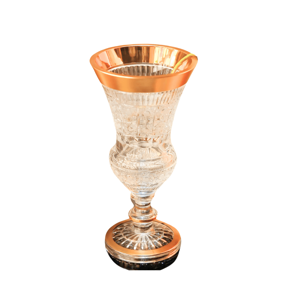 Lọ hoa cúp pha lê khảm vàng Arcade 35,5cm nổi bật với họa tiết mài truyền thống M57, mang đến khả năng khúc xạ ánh sáng đặc trưng của pha lê, tạo nên vẻ lấp lánh, trong suốt đầy cuốn hút. Chất liệu pha lê cao cấp không chỉ đảm bảo độ trong sáng hoàn hảo mà còn làm tôn lên giá trị thẩm mỹ tinh tế của từng sản phẩm.
