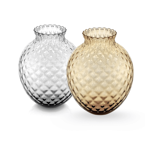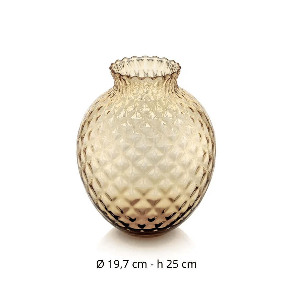 Lọ hoa IVV Infiore có kiểu dáng tròn mềm mại với phần miệng uốn lượn tự nhiên, gợi liên tưởng đến những cánh hoa đang hé nở. Toàn thân lọ được phủ họa tiết hoa nổi dạng kim cương 3D tinh xảo, tạo hiệu ứng ánh sáng phản chiếu rực rỡ và chiều sâu khi quan sát. Các ô nổi liên tiếp mang đến cảm giác như từng bông hoa nhỏ được dập nổi thủ công, vừa sang trọng vừa độc đáo.