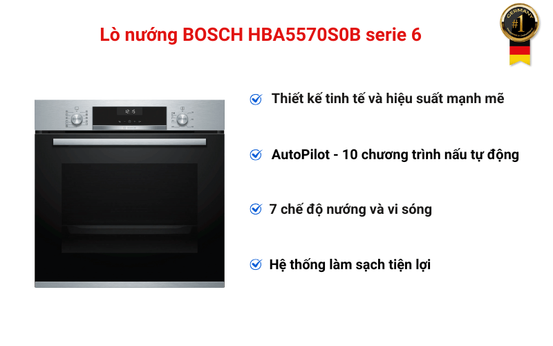 Với màu sắc đen và bạc sang trọng, BOSCH HBA5570S0B serie 6 không chỉ là một thiết bị nhà bếp thông thường mà còn là điểm nhấn thẩm mỹ cho không gian bếp của bạn. Thiết kế âm tủ giúp tiết kiệm diện tích, mang lại sự gọn gàng và hiện đại cho căn bếp.