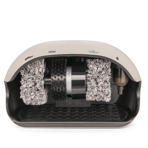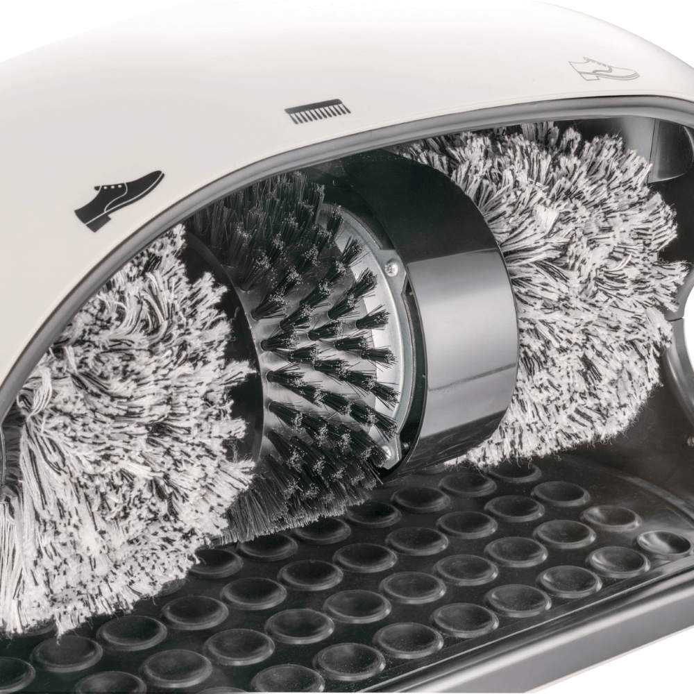 Máy được trang bị 3 chổi xoay chuyên dụng, gồm 1 chổi thô để loại bỏ bụi bẩn và 2 chổi mềm bằng lông polyester cao cấp dành riêng cho giày màu sáng và màu tối. Cấu tạo chổi giúp làm sạch kỹ mà vẫn đảm bảo an toàn cho bề mặt da giày, giữ được độ bóng và form dáng.