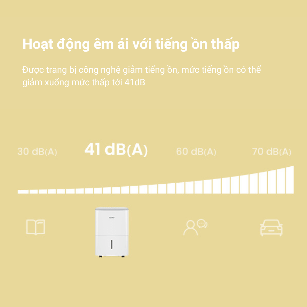 Độ ồn là một trong những yếu tố không thể bỏ qua khi lựa chọn các sản phẩm máy lọc khí và hút ẩm. Máy hút ẩm Comfee MDDF-20DEN7-WF ghi điểm bởi khả năng vận hành êm ái với độ ồn có thể xuống tới 41dB, tương đương với âm thanh của một cuộc nói chuyện nhẹ nhàng, đảm bảo không gây ảnh hưởng đến sự tập trung hay giấc ngủ của người dùng trong các không gian cần sự yên tĩnh như phòng ngủ, phòng làm việc hay thư viện.