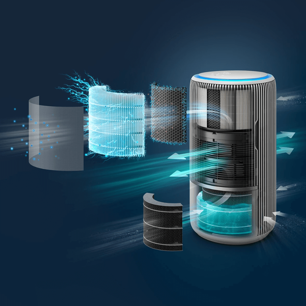 Đồng thời, lớp than hoạt tính hấp thụ mùi và loại bỏ hơn 90% chất ô nhiễm khí như NO₂, VOC hay toluene, đảm bảo hiệu quả cao mà vẫn an toàn do không phát ion, ozone hay hóa chất.