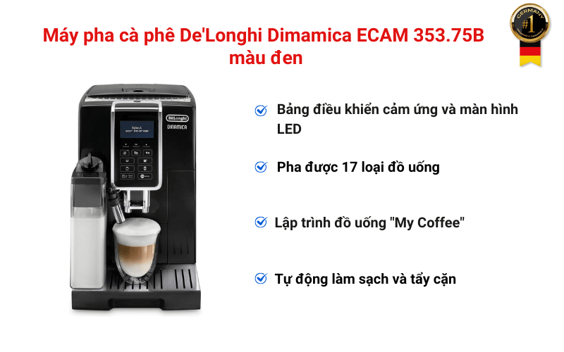De'Longhi Dimamica ECAM 353.75B là sự kết hợp hoàn hảo giữa thiết kế Ý tinh tế, công nghệ pha chế tự động tiên tiến và khả năng tùy chỉnh linh hoạt. Từ việc xay hạt tươi mới, lựa chọn đồ uống đa dạng chỉ với một chạm, hệ thống tạo bọt sữa LatteCrema đẳng cấp đến việc vệ sinh và bảo dưỡng dễ dàng, chiếc máy này mang đến trải nghiệm cà phê toàn diện và tiện nghi, biến ngôi nhà bạn thành một quán cà phê Ý đích thực.