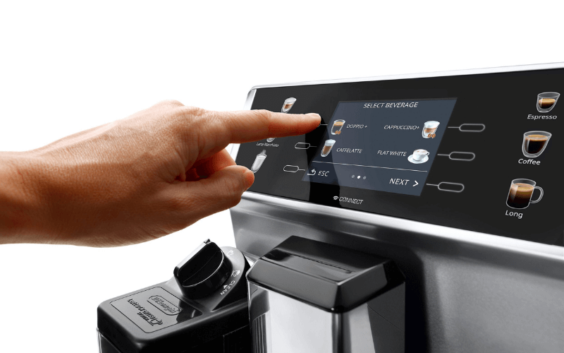 Công Nghệ One Touch: De'Longhi đã đưa 6 món đồ uống phổ biến nhất ra ngay màn hình chính là Espresso, Coffee, Long Coffee, Cappuccino, Latte Macchiato và Sữa nóng. Bạn không cần phải truy cập vào các menu phức tạp để tìm món yêu thích. Chỉ cần một cái chạm nhẹ vào biểu tượng tương ứng, máy sẽ tự động thực hiện toàn bộ quy trình từ xay, nén, ủ đến đánh sữa và rót ra ly.