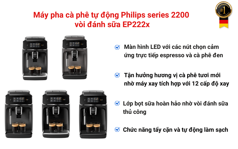 Trong gian bếp hiện đại, Máy pha cà phê tự động Philips Series 2200 vòi đánh sữa EP222x sẽ mang đến cho bạn trải nghiệm cà phê chuẩn quán ngay tại nhà. Sản phẩm là sự kết hợp hoàn hảo giữa công nghệ hiện đại và sự tiện lợi tối đa, giúp người dùng dễ dàng thưởng thức những tách Espresso đậm đà hay Cappuccino béo ngậy chỉ với một vài thao tác đơn giản. Với thiết kế thông minh cùng hệ thống vệ sinh tự động hiệu quả, đây là lựa chọn lý tưởng cho những ai yêu thích hương vị cà phê tươi mới mỗi ngày. Cùng Germany S&T khám phá thêm các tính năng nổi bật của Máy pha cà phê tự động Philips Series 2200 vòi đánh sữa EP222x ngay tại đây!