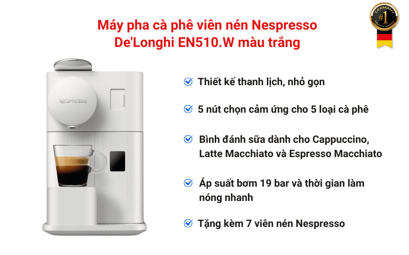 Máy pha cà phê viên nén Nespresso De'Longhi EN510.W màu trắng là sự kết hợp hoàn hảo giữa công nghệ hiện đại và nghệ thuật pha chế cà phê. Với thiết kế hiện đại, áp suất 19 bar chuẩn Ý và hệ thống đánh sữa tự động, máy sẽ giúp bạn dễ dàng thưởng thức những ly cà phê chuẩn vị, từ Espresso đậm đà đến Latte Macchiato thơm ngậy. Cùng Germany S&T khám phá chi tiết về sản phẩm ngay sau đây!