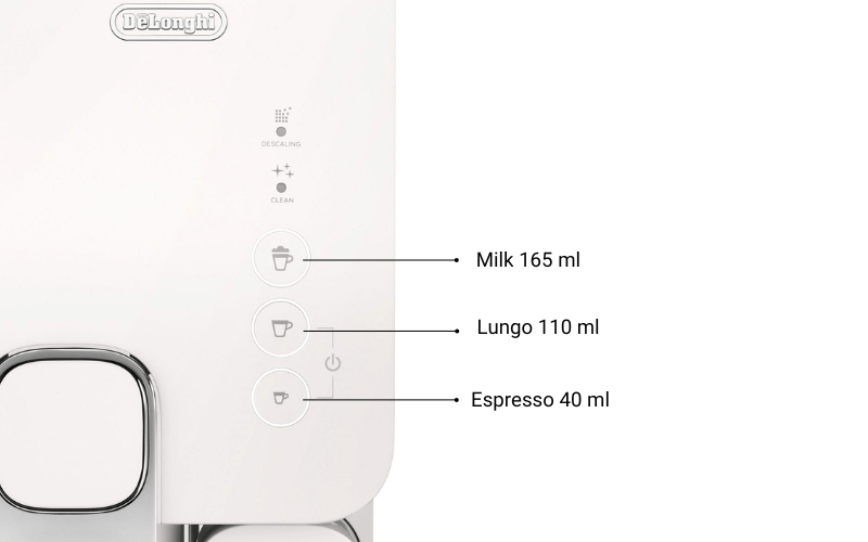 Trong đó, hai chương trình pha chế đặc trưng là Espresso (40ml) và Lungo (110ml) được lập trình tối ưu để tái hiện hương vị cà phê chuyên nghiệp ngay tại nhà.