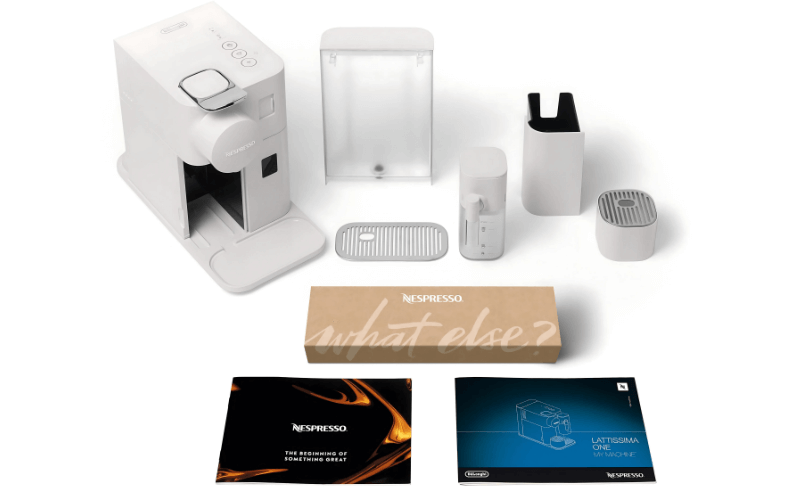 Bộ phụ kiện bao gồm: Hướng dẫn sử dụng, sách công thức cà phê, khay kê cốc thấp, bình đựng nước sau máy, bình đựng sữa đánh sữa và khay đựng bã viên nén.