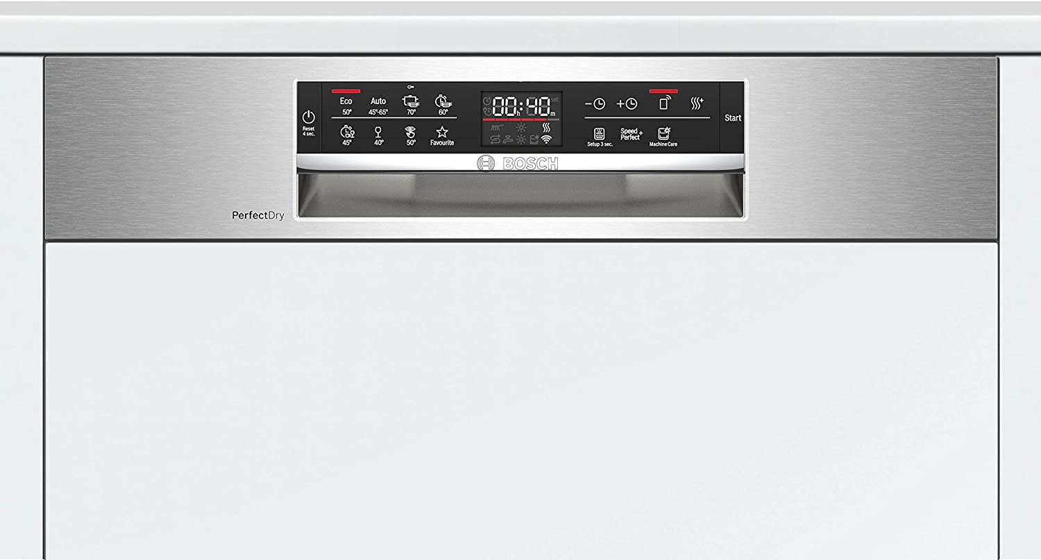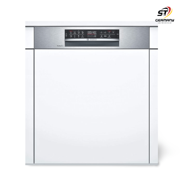 Máy rửa bát SMI6ZCS49E được thiết kế âm bán phần với mặt gỗ phía trước dưới bảng điều khiển