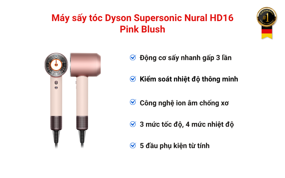 Dyson Supersonic Nural không chỉ là một chiếc máy sấy tóc, mà là giải pháp chăm sóc tóc toàn diện. Từ khả năng làm khô nhanh, kiểm soát nhiệt, bảo vệ da đầu đến bộ phụ kiện tạo kiểu chuyên nghiệp – tất cả đều được tối ưu để mang lại mái tóc bóng khỏe, vào nếp chuẩn salon mỗi ngày tại nhà.
