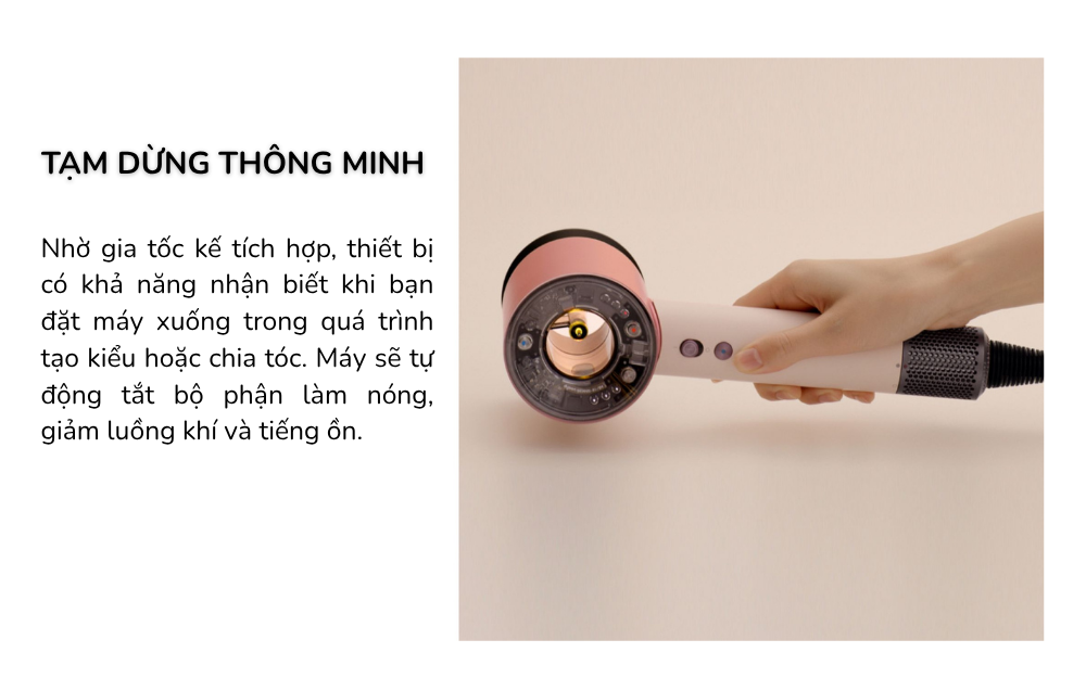 Máy được tích hợp cảm biến gia tốc có khả năng phát hiện khi thiết bị được đặt xuống. Khi đó, hệ thống làm nóng sẽ tự động tắt và luồng khí giảm xuống, vừa tiết kiệm điện năng, vừa ngăn ngừa rủi ro cháy tóc, đồng thời tăng độ bền cho sản phẩm. Đây là tính năng lý tưởng cho người dùng bận rộn hoặc hay ngắt quãng trong quá trình sấy tóc.