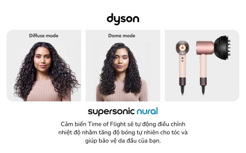 Dyson Supersonic Nural mang đến 3 chế độ sấy chuyên biệt: sấy nhanh, sấy nhẹ nhàng và tạo kiểu. Đồng thời, người dùng có thể chọn 1 trong 4 mức nhiệt độ phù hợp với từng loại tóc: 100°C để làm khô nhanh, 80°C cho tóc thường, 60°C cho tóc mỏng và 28°C (sấy lạnh) để định hình kiểu tóc hoặc dưỡng tóc sau tạo kiểu.