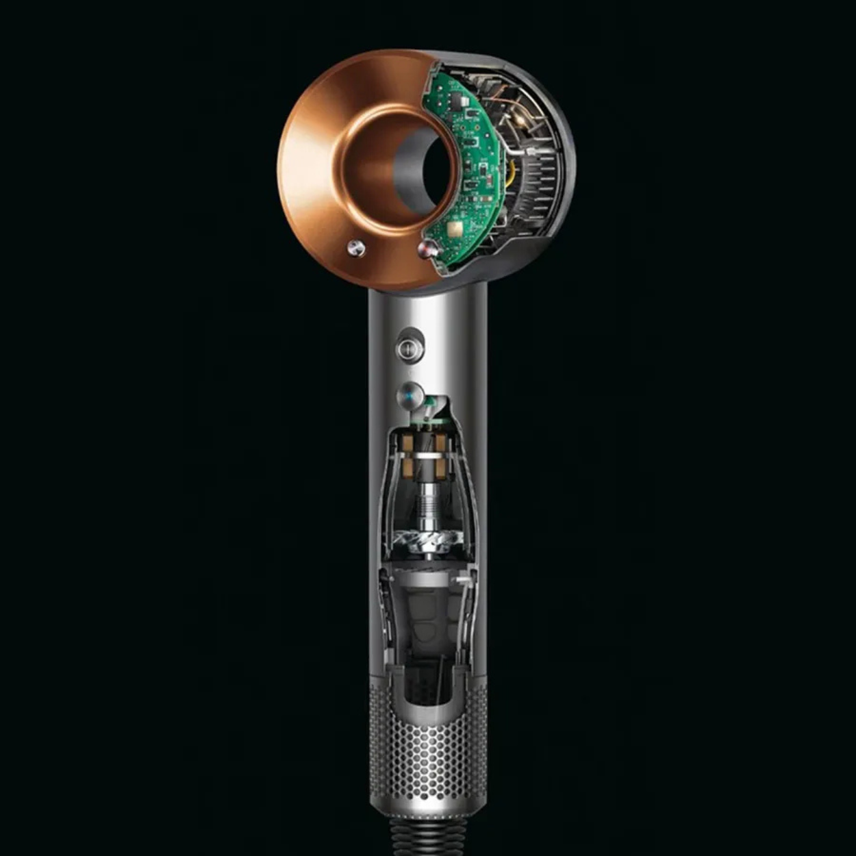 Động cơ V9 do Dyson nghiên cứu và phát triển độc quyền là trái tim của máy sấy Dyson Supersonic. Quay với tốc độ lên tới 110.000 vòng/phút, động cơ tạo ra luồng khí mạnh mẽ, tập trung gấp 3 lần máy sấy thông thường. Nhờ vậy, mái tóc được làm khô nhanh hơn mà không cần nhiệt độ cao, giúc bảo toàn độ ẩm và độ bóng tự nhiên.
