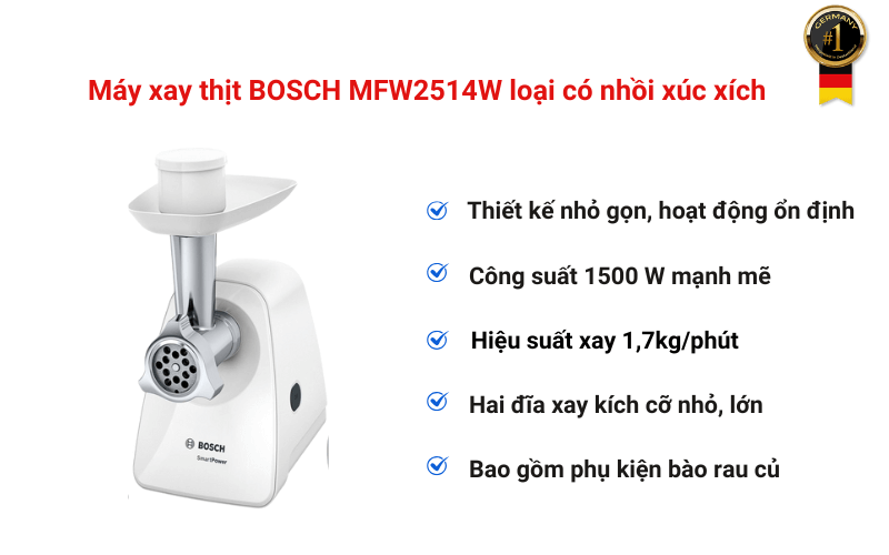 Với thiết kế nhỏ gọn, động cơ mạnh mẽ và khả năng xử lý linh hoạt từ xay thịt, nhồi xúc xích đến bào rau củ, máy xay BOSCH MFW2514W xứng đáng là trợ thủ đa năng trong căn bếp hiện đại. Một thiết bị vừa giúp tiết kiệm thời gian, vừa mang lại hiệu quả chế biến vượt trội, được bảo chứng bởi chất lượng và uy tín từ thương hiệu Đức. Hiện sản phẩm đang có mặt tại Germany S&T – nơi mang đến dụng cụ nhà bếp cao cấp châu Âu cho mọi gia đình Việt.