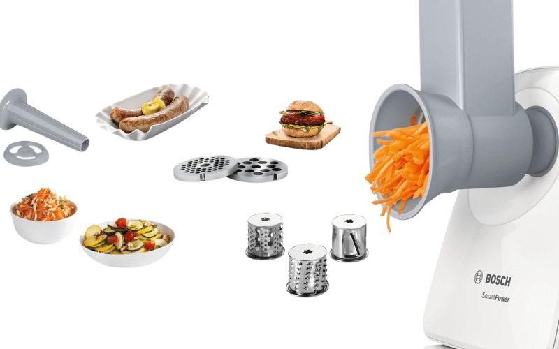 Không chỉ dùng để xay thịt, máy xay còn được trang bị bộ phụ kiện bào rau củ đi kèm với ba đầu bào chuyên dụng: