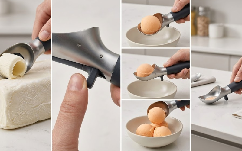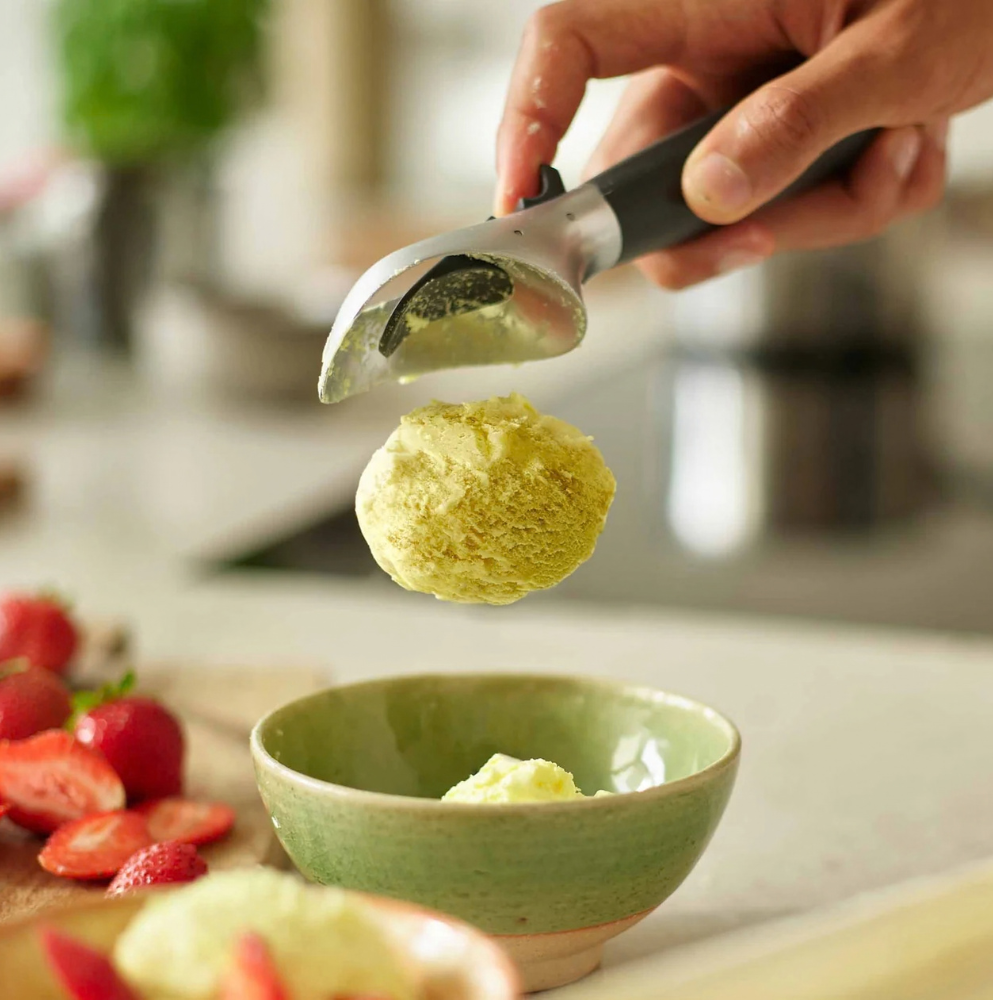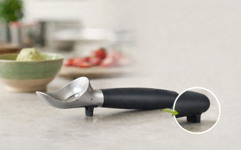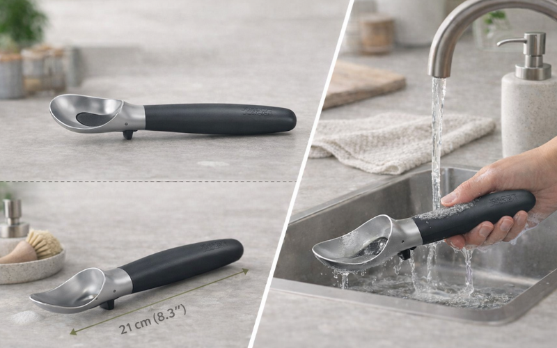 Sản phẩm sở hữu cơ chế nhả kem độc đáo: bạn chỉ cần kéo nhẹ phần gờ gác phía sau để viên kem rời ra một cách hoàn hảo. Đầu muỗng làm từ hợp kim kẽm chắc chắn, có khả năng cắt xuyên qua các loại kem cứng hay sorbet một cách mượt mà và nhẹ nhàng nhất. Sự kết hợp này giúp việc phục vụ kem trở nên nhanh chóng, hiệu quả mà không làm biến dạng hình khối đẹp mắt của món ăn.