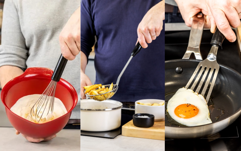 Các sản phẩm được làm từ chất liệu cao cấp như nhựa chịu nhiệt hoặc inox bền bỉ, an toàn với nhiều loại nồi chảo, kể cả chống dính. Đồng thời, toàn bộ dụng cụ đều dễ vệ sinh và sử dụng an toàn trong máy rửa bát, mang lại sự tiện lợi tối đa cho người dùng.