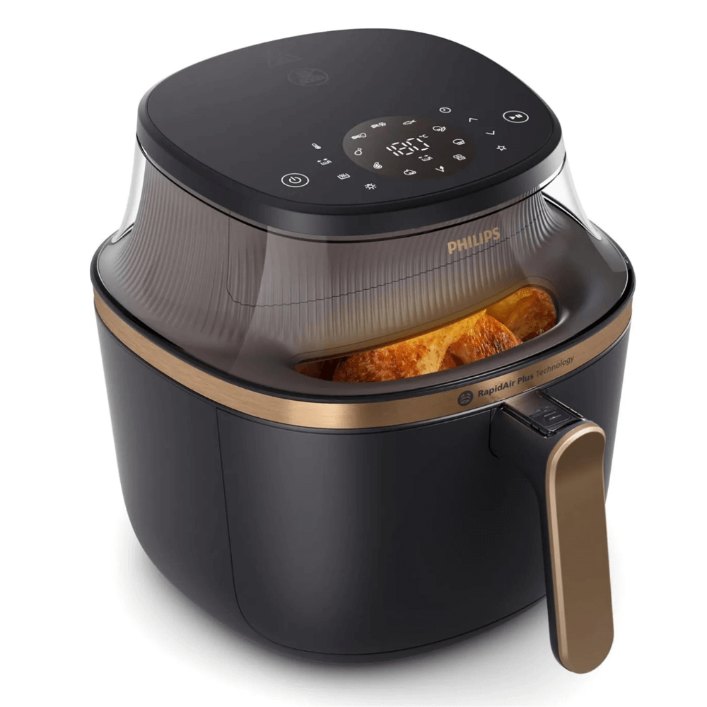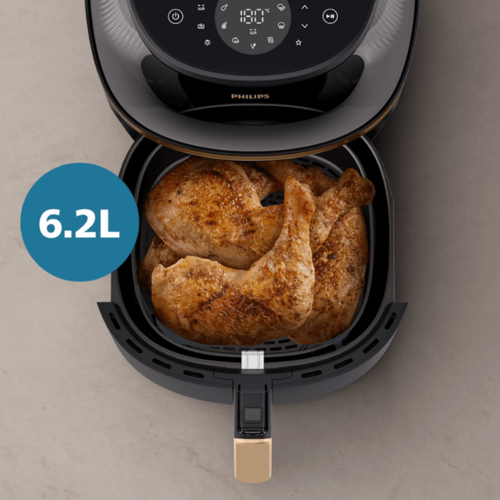 Với dung tích 6,2 lít, Philips NA332/00 có khả năng xử lý lượng lớn thực phẩm trong một lần nấu. Khay chiên rộng đủ để chiên nguyên con gà 1,5 kg, 8 đùi gà, 5 miếng cá hồi hoặc 7 bánh muffin. Điều này giúp bạn tối ưu thời gian nấu nướng, đặc biệt trong những bữa ăn gia đình, tiệc nhỏ hoặc những ngày bận rộn. Dung tích lớn cũng hạn chế tình trạng xếp chồng thực phẩm – nguyên nhân khiến thức ăn chín không đều trong các loại nồi chiên nhỏ.