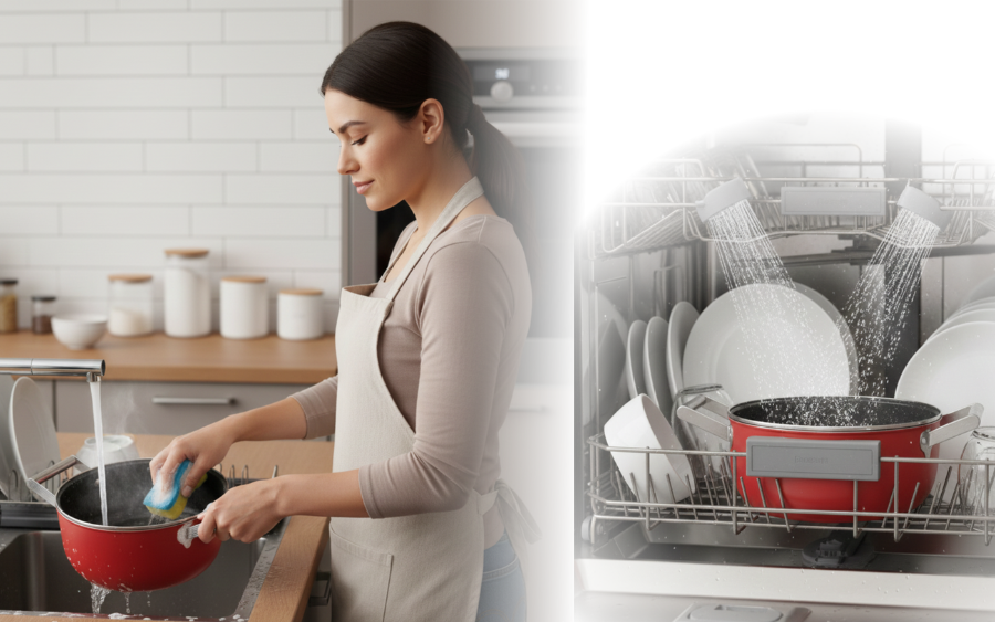 Đặc biệt, toàn bộ nồi gồm thân nồi, tay cầm và nắp kính đều an toàn khi sử dụng với máy rửa bát mà không lo bong tróc lớp chống dính hay xỉn màu kim loại. Đây là ưu điểm vượt trội so với các dòng nồi truyền thống, giúp tiết kiệm thời gian dọn dẹp và mang lại trải nghiệm nấu nướng tiện lợi, sạch sẽ cho gia đình bận rộn.