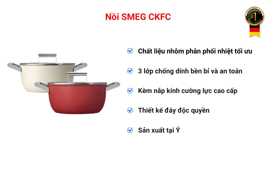 Nồi SMEG CKFC là một trong những sản phẩm tiêu biểu, kết hợp thiết kế retro Ý cùng công nghệ chế tác chất lượng cao để mang đến trải nghiệm nấu nướng trọn vẹn, đẹp mắt, tiện dụng và đẳng cấp.